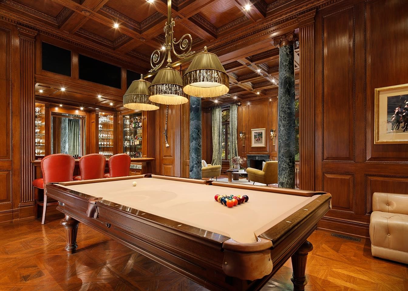 A luxurious game room designed for family entertainment and social gatherings, centered around a stylish billiard table with a cream felt top. Rich, paneled wood walls and a coffered ceiling add warmth and elegance, while sophisticated green marble columns provide architectural interest. The space includes a built-in bar with glass shelving and bold red high-back stools for casual seating. Plush mustard armchairs surround a modern coffee table near the fireplace, perfect for relaxation. Ambient lighting and classic decor elements ensure a cozy yet refined atmosphere, making this room ideal for both family fun and entertaining guests of all ages.