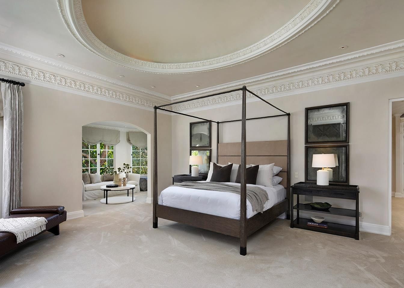 A spacious and elegant master bedroom boasts a sophisticated four-poster bed as its centerpiece, framed by plush carpeting and soft, neutral walls. The room is filled with natural light from an adjoining lounge area separated by a graceful archway, offering a cozy spot for reading or relaxing. Detailed crown molding and a dramatic tray ceiling add a touch of architectural luxury. The thoughtful furniture arrangement supports both comfort and functionality, including ample nightstands and a chaise lounge. The overall palette of warm creams, crisp whites, and dark accent furniture creates a calm, inviting environment ideal for families seeking tranquility.