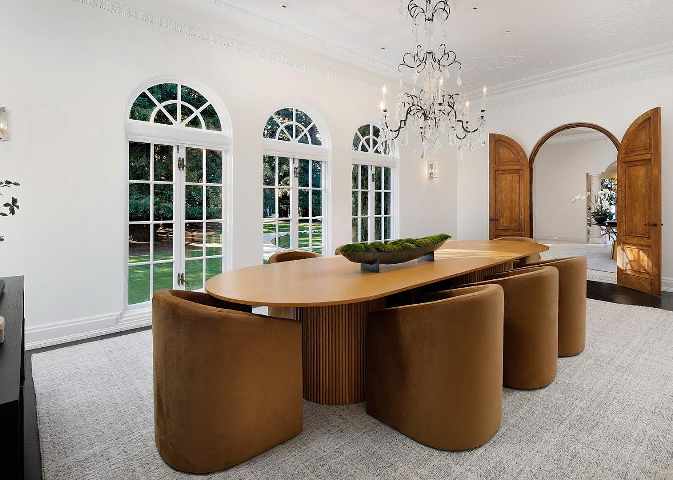 Sunlight floods this spacious dining room through grand arched windows, which overlook green gardens and foster a serene, open atmosphere ideal for family gatherings. The sleek, contemporary oval table is surrounded by plush, suede-like tan chairs, offering comfortable seating for all ages. A dramatic crystal chandelier adds a touch of classic luxury, harmonizing beautifully with the high white ceilings adorned with intricate molding. The neutral color scheme—soft whites, warm wood tones, and subtle grey carpeting—creates a calming, versatile backdrop, while double wooden doors enhance the natural flow between entertaining spaces, perfect for both everyday meals and special occasions.