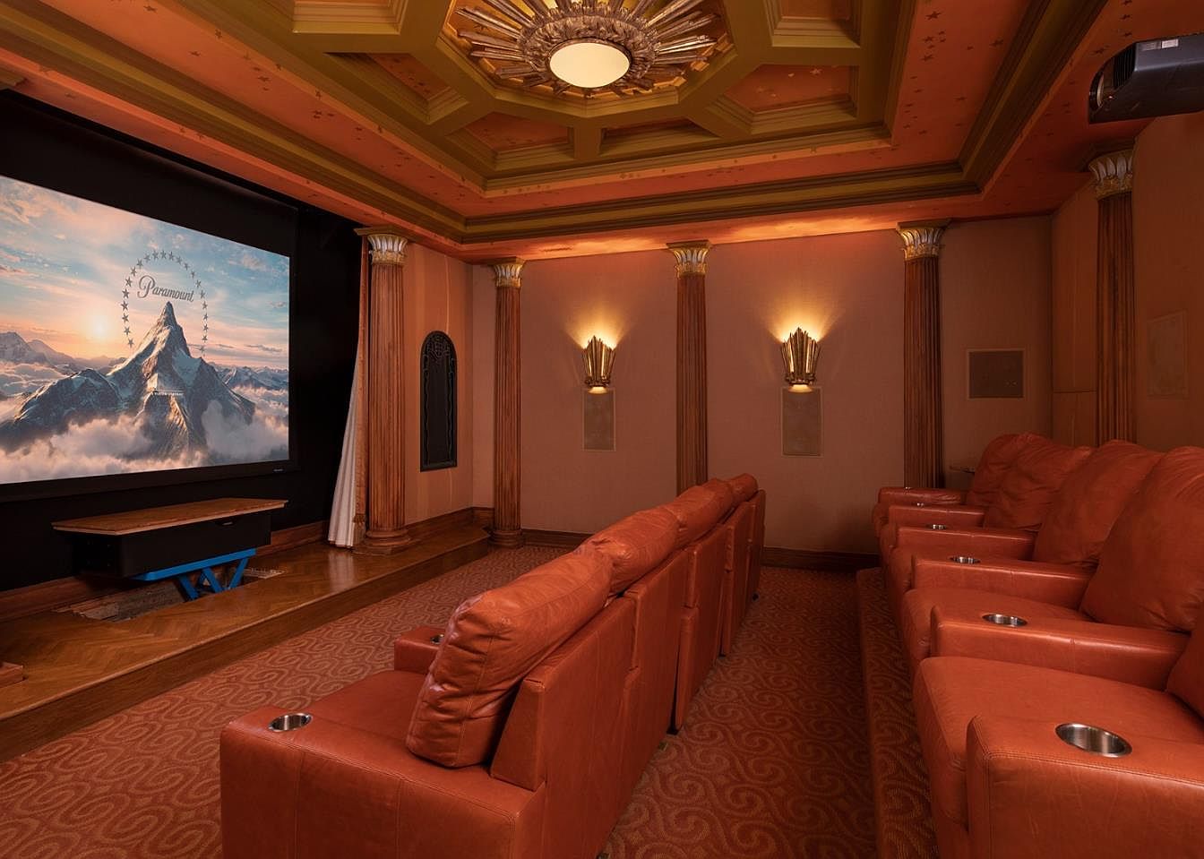 Luxurious home theater designed for family enjoyment, featuring two rows of plush, overstuffed leather recliners each equipped with convenient built-in cup holders. Warm earth tones dominate the color scheme, highlighted by soft, golden lighting from ornate sconces and an elaborate coffered ceiling with art deco accents. Corinthian-inspired columns add architectural character along the walls, while deep carpeting in a swirling pattern enhances comfort and sound absorption. The large movie screen is framed by elegant woodwork, with plenty of space up front for children to sit or play. This inviting setup delivers a cinematic experience the whole family can enjoy together.