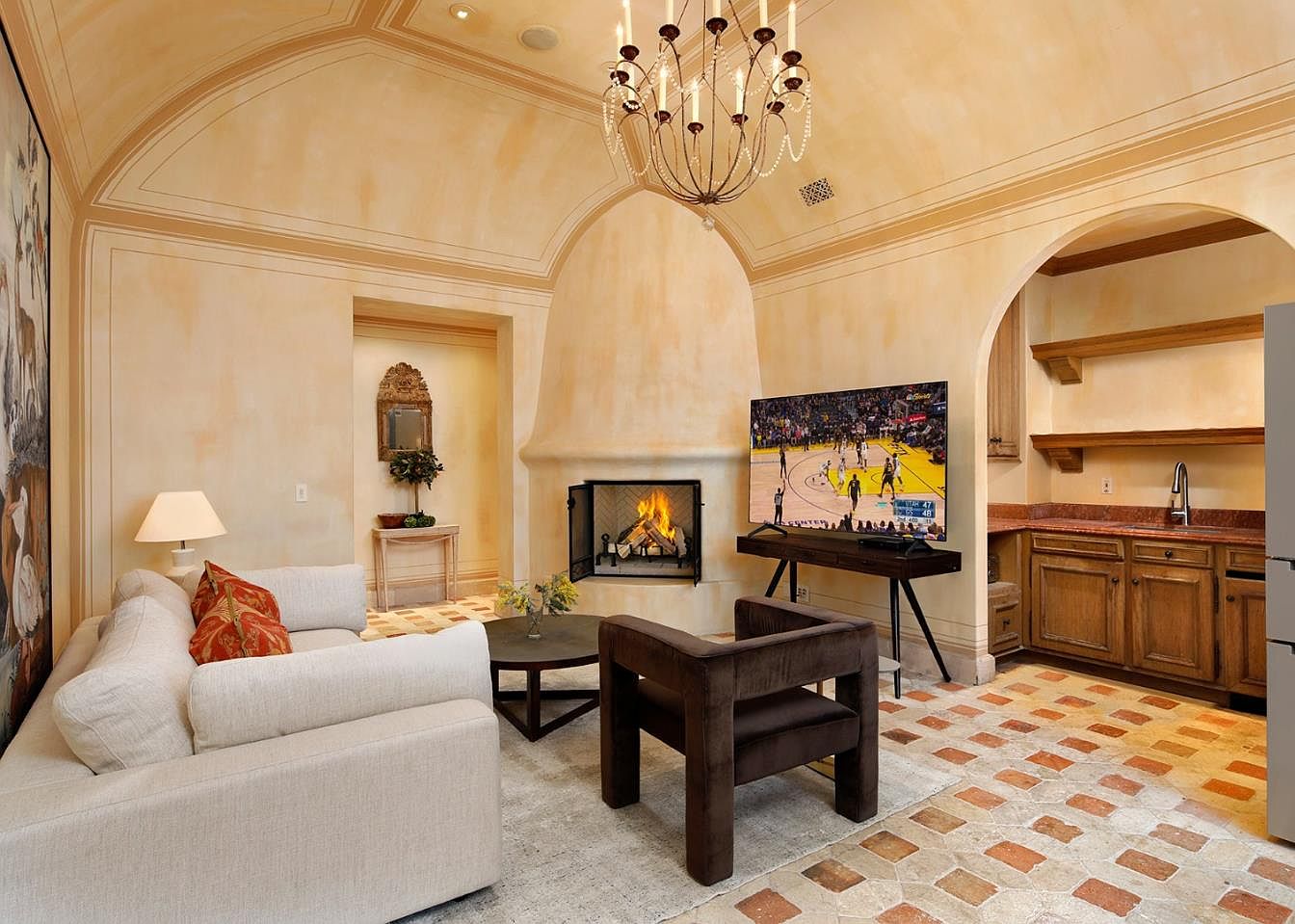 Warm, neutral tones and a softly arched ceiling create an inviting family room perfect for relaxation and togetherness. The layout seamlessly blends a plush sectional sofa and accent chair with a cozy corner fireplace, ideal for gathering on chilly evenings. Contemporary touches like an oversized television and a functional wet bar with open shelving add modern convenience. Terracotta and stone patterned flooring adds rustic charm, while the chandelier brings elegance overhead. Thoughtfully arranged artwork, ambient lighting, and durable surfaces ensure the space is family-friendly, stylish, and welcoming—a harmonious blend of comfort and sophistication for everyday living.