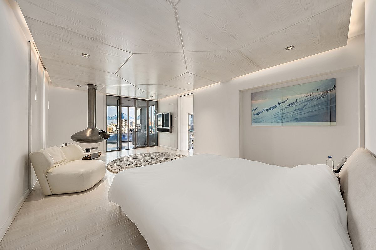 A spacious master bedroom bathed in soft natural light, featuring an open layout that seamlessly blends relaxation and functionality. The room is anchored by a plush, oversized bed accented with crisp white linens, creating an inviting, serene atmosphere. A cozy, creamy armchair offers a comfortable reading nook near a contemporary suspended fireplace, perfect for family gatherings or quiet evenings. Architectural details include a uniquely paneled ceiling and wide plank hardwood floors, giving the space a sophisticated, modern edge. Floor-to-ceiling glass doors connect the room to an outdoor balcony, providing stunning views and easy access to fresh air.