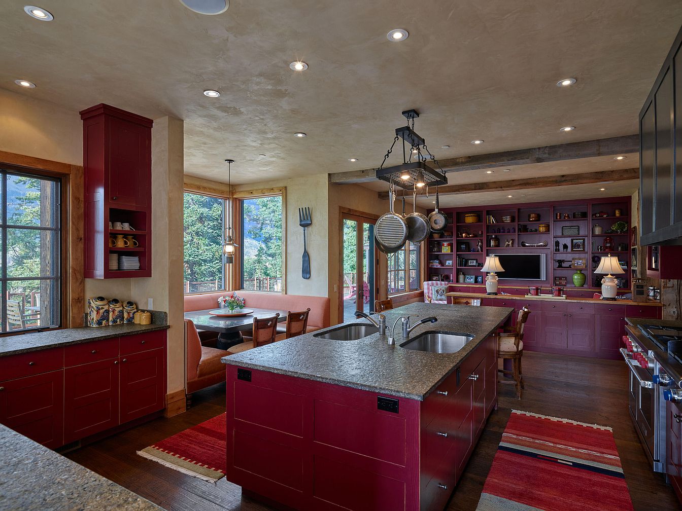 A vibrant and welcoming kitchen features deep red cabinetry paired with textured stone countertops, lending a cozy, rustic charm to the space. The central island serves as both a prep area and gathering spot, while overhead racks hold pots for easy access. Large windows in the breakfast nook flood the area with natural light, offering stunning views of greenery and creating a perfect family dining spot. A built-in wall unit with open shelving and a television blends practicality with decorative appeal. Warm, earthy tones, wood accents, plush seating, and colorful rugs make this space ideal for family meals and connection.