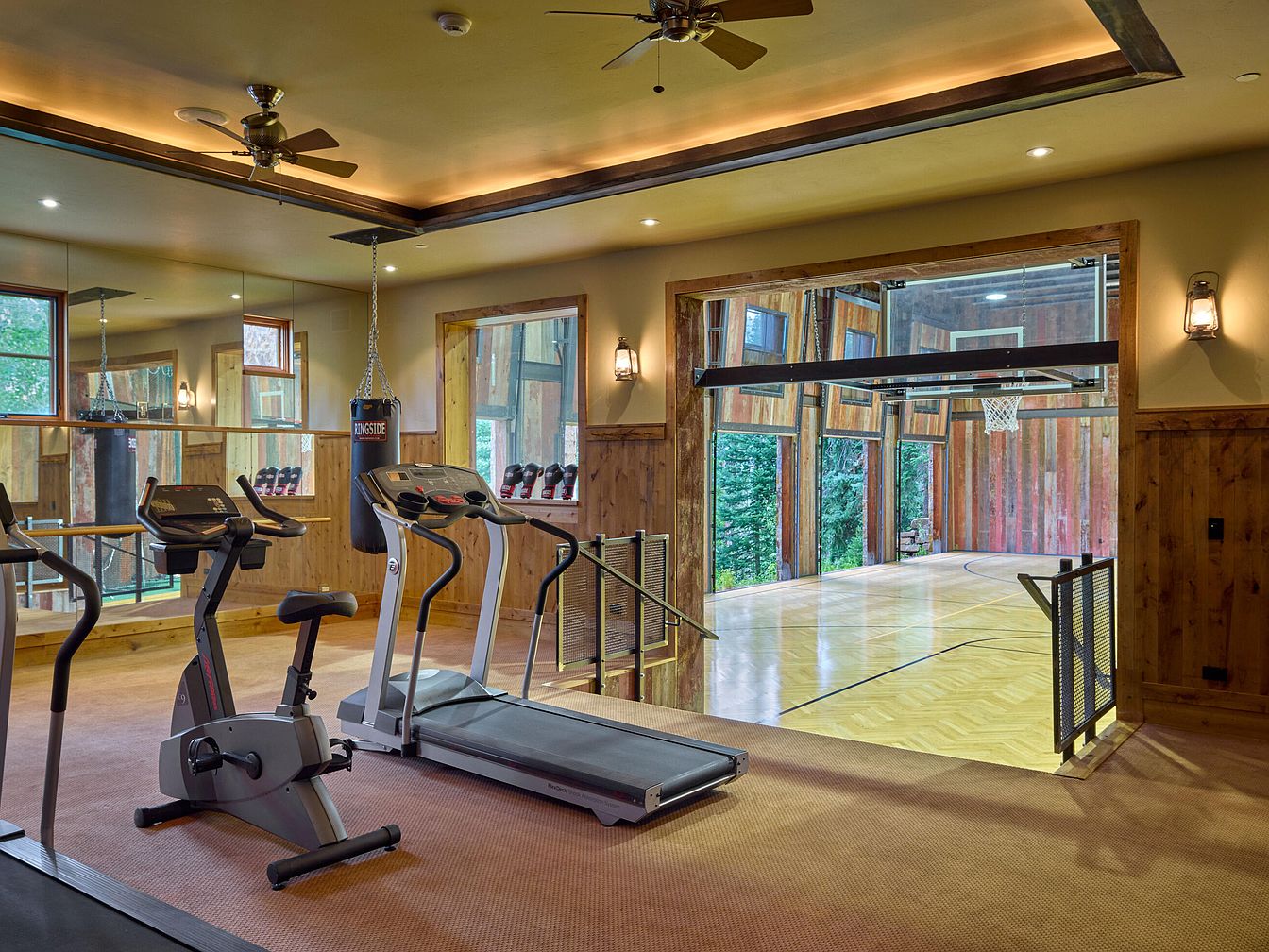 This inviting recreation space features a well-equipped home gym seamlessly connected to a bright indoor basketball court. Large windows bring in natural light while offering views of surrounding greenery, creating an energizing atmosphere for the whole family. The gym area is furnished with high-quality cardio equipment, a treadmill, stationary bike, and a hanging punching bag for a diverse workout routine. The space is unified by warm wooden trims and earthy tones, complemented by recessed ceiling lights and ceiling fans for comfort. This thoughtfully designed layout encourages family fitness and active lifestyles within a cozy, wood-accented setting.