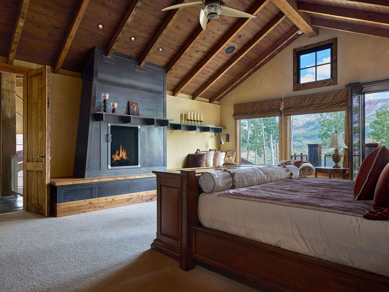 A spacious master bedroom featuring vaulted wooden ceilings with exposed beams, giving the space a warm and rustic lodge atmosphere. The layout centers around a large bed dressed in earth-toned linens, accented with plush pillows, offering both comfort and elegance. A striking metal and wood fireplace anchors the room, perfect for family gatherings or relaxing evenings. Large windows and glass doors provide breathtaking mountain views and abundant natural light. The soft beige carpet underfoot adds to the cozy ambiance, while a seating nook by the window makes an inviting spot for reading or enjoying the scenery, creating a truly family-friendly retreat.