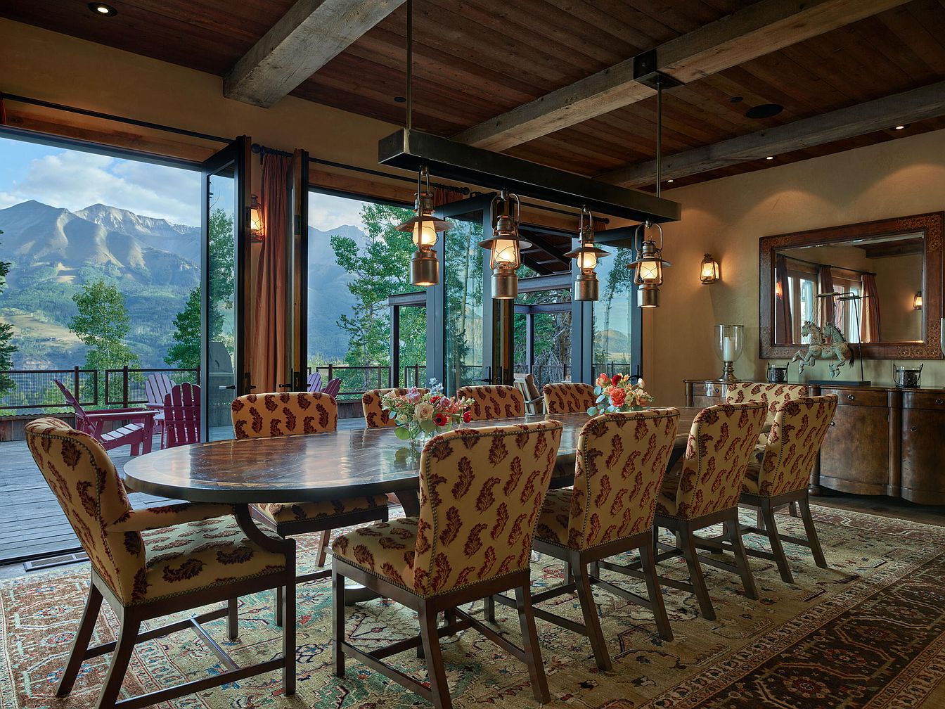 An expansive dining area blends rustic elegance with breathtaking views of distant mountains through large glass doors that open to a scenic deck. The space features a long, polished wooden table surrounded by upholstered chairs with a warm, patterned fabric, offering ample seating for family gatherings or entertaining guests. A traditional rug anchors the room, while exposed wooden beams and lantern-style pendant lighting contribute to the cozy, lodge-inspired atmosphere. Earthy wall tones and a vintage sideboard with decorative elements and fresh flowers evoke a welcoming, family-friendly feel. Generous windows flood the room with natural light, seamlessly connecting indoors and outdoors.