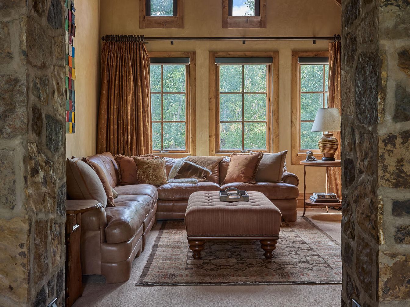 Warm and inviting, this living room features a spacious sectional leather sofa arranged in an L-shape, perfect for family gatherings or quiet relaxation. Large windows allow abundant natural light to fill the space, while rich wooden trim and earthy stone accents create a rustic yet elegant atmosphere. The color palette, with deep tans and caramel hues, is complemented by textured throw pillows and heavy drapes, offering comfort and coziness. A generously sized ottoman serves as both a coffee table and extra seating, enhancing the room’s family-friendly versatility. Thoughtful details like the area rug and table lamp add to the welcoming ambiance.