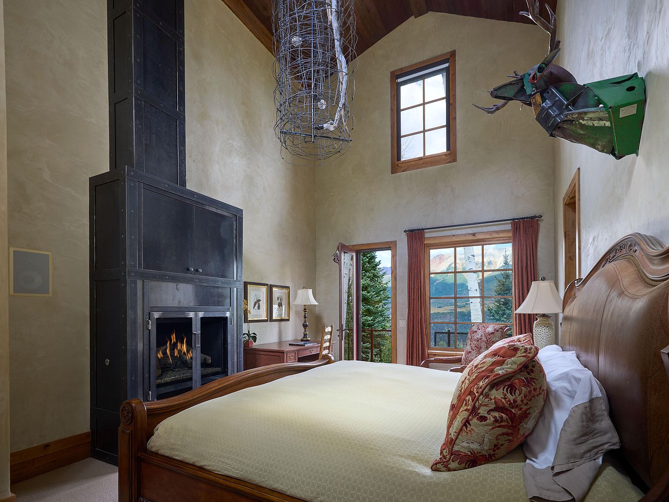 Vaulted ceilings and tall windows bring natural light and mountain views into this spacious master bedroom. A dramatic black steel fireplace anchors the room, lending a modern-industrial touch to the rustic setting. Warm, earth-toned plaster walls harmonize with wood trim and a curved headboard, creating an inviting atmosphere. A cozy seating area beside the window is perfect for relaxing together, while soft, textured linens and decorative pillows add layers of comfort. Unique details such as the artistic deer head sculpture and whimsical chandelier bring personality, making the space both family-friendly and inspiring for daily living.