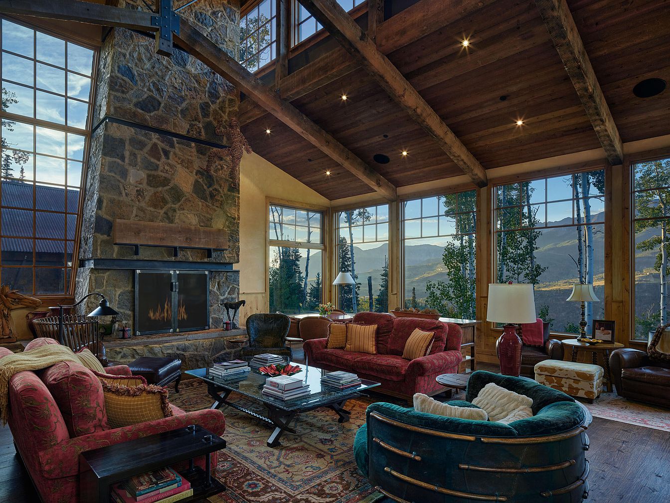 This spacious living room boasts soaring ceilings with exposed wooden beams and floor-to-ceiling windows that offer breathtaking mountain views, flooding the space with natural light. The room’s focal point is a grand stone fireplace, perfect for gathering on cozy family nights. Warm, earthy tones and rich textures are highlighted by a collection of inviting furniture, including deep red sofas, a plush teal armchair, and patterned area rugs that add a sense of comfort and charm. Family-friendly features include ample seating and open sightlines, making it ideal for entertaining or relaxing together while enjoying the panoramic vistas outside.