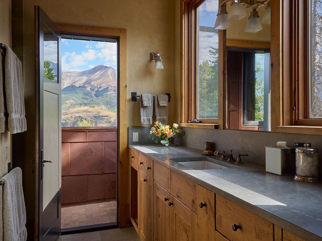 Natural wood cabinetry and stone countertops create a warm, rustic feel in this bathroom, perfectly balanced with the calming tan walls. Large windows flood the space with light and offer breathtaking mountain vistas, making daily routines tranquil and inspiring. Elegant fixtures and wall-mounted lighting provide a modern touch, while the double sinks and ample counter space ensure functionality for family use. Soft neutral towels, thoughtful storage, and fresh flowers add cozy, homey accents. Direct outdoor access makes this space practical for active families returning from adventures, seamlessly blending indoor comfort with outdoor beauty.