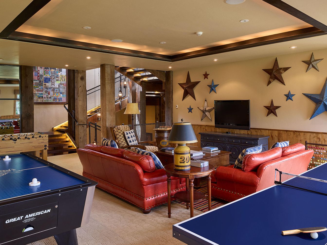 A spacious and inviting family game room combines relaxation and entertainment, featuring plush red leather sofas around a central coffee table and TV setup. The playful spirit is enhanced with wall-mounted star decor in various sizes and colors, as well as games such as foosball, air hockey, and ping pong for endless family fun. Natural wood beams, exposed staircase, and rustic accents create a cozy yet vibrant atmosphere. The color palette blends earthy neutrals with pops of bold red and navy blue, while plaid and star-patterned pillows add warmth and Americana charm, making this space perfect for gatherings and playful evenings together.