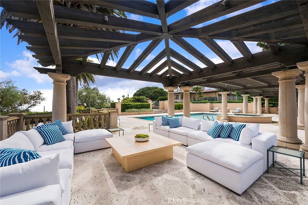 Spacious outdoor lounge area designed for relaxation and entertaining, featuring a modern pergola with exposed beams for shade. Comfortable white sectional sofas adorned with blue and white striped accent pillows create a breezy, coastal vibe, while a large light wood coffee table anchors the seating arrangement. The area is surrounded by elegant balustrades and classical columns, seamlessly connecting the lounging space to the sparkling pool and adjacent hot tub. The open layout allows for easy supervision of children in the pool, making it family friendly and perfect for gatherings. Neutral stone flooring complements the airy, inviting atmosphere.