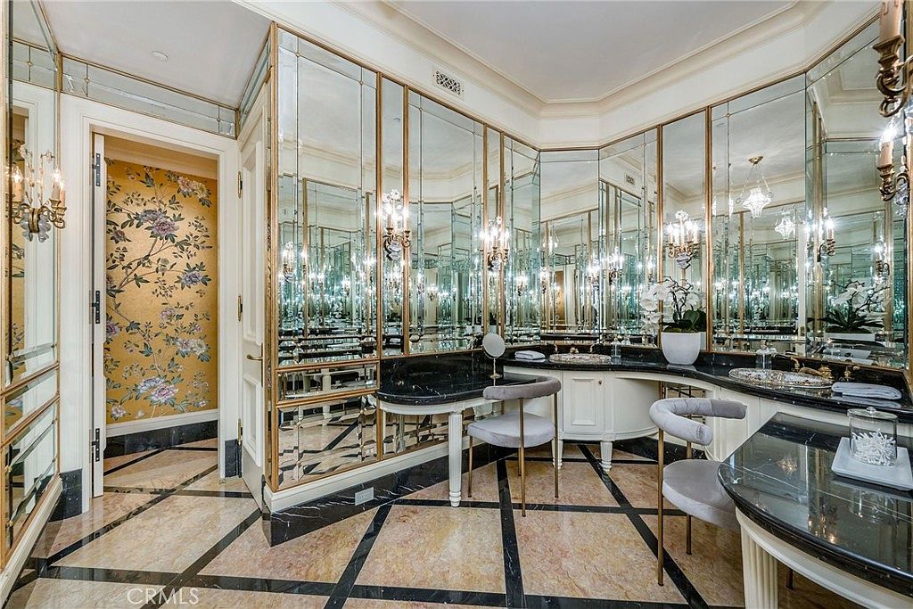 Step into a glamorous dressing room featuring walls lined with floor-to-ceiling mirrors, maximizing light and making the space feel both expansive and inviting. Soft, tufted vanity chairs provide comfort for daily routines, while the curved black marble countertops add a luxurious touch. Elegant sconces, paired with gold accents in the cabinetry and mirror frames, evoke classic sophistication. The warm marble flooring is accented with bold black lines for a dramatic effect, while floral wallpaper glimpsed through an open doorway brings a cheerful, family-friendly energy. Practical features like dual seating and ample surface space make this room perfect for shared use or family preparation time.