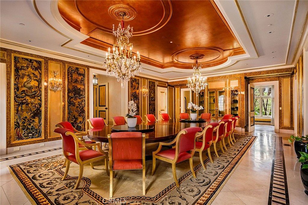 Opulent and inviting, this formal dining room is designed for grand family gatherings and elegant entertaining. The oval table is surrounded by plush scarlet chairs with gilded frames that add a regal touch. Ornate golden moldings and exquisite painted panels adorn the walls, complemented by two dazzling crystal chandeliers, enhancing the sense of luxury. A neutral-toned rug anchors the space, while tall doors offer seamless access to adjacent rooms and views of lush greenery. The warm bronze ceiling adds depth and drama, while natural light, architectural columns, and tasteful indoor plants complete the welcoming and sophisticated atmosphere.