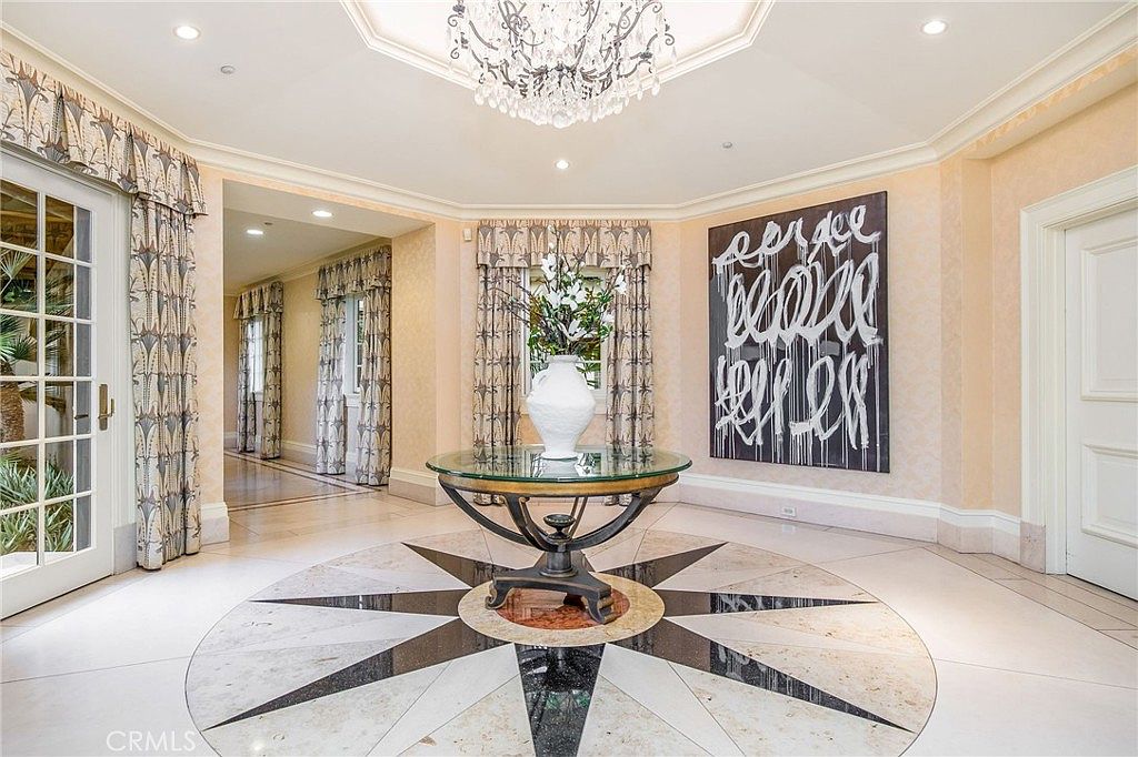 A sophisticated foyer welcomes guests with a grand, circular layout highlighted by an intricate starburst marble inlay beneath an ornate glass table centerpiece. High ceilings, softened with a delicate crystal chandelier, create an airy first impression, while large windows and a glass-paned door flood the space with natural light. Neutral walls paired with soft, patterned drapes exude timeless charm and make this area perfect for families, allowing safe and ample movement. Modern art adds a bold focal point, effortlessly blending contemporary style with classic architectural molding, providing warmth, elegance, and inviting hospitality for everyday living or special gatherings.