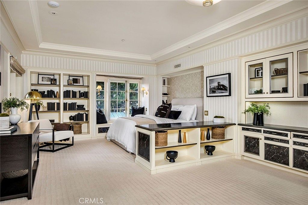 This spacious master bedroom suite combines elegance and comfort with a neutral palette of creams, whites, and subtle beige tones. The room features built-in cabinetry and shelving for both storage and decorative display, making it a practical choice for families. Generous floor space and soft, plush carpeting create a cozy, inviting environment, while natural light filters in through large windows, brightening the room. Modern yet timeless furniture, such as a sleek writing desk and accent chairs, complements the overall classic design. Thoughtful finishes like crown molding, striped wallpaper, and fresh greenery add a sophisticated yet lived-in appeal, perfect for both relaxation and productivity.