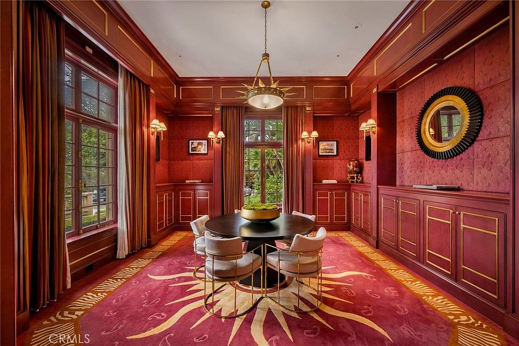 This luxurious dining room features rich, deep red paneling with gold trim, creating a warm yet sophisticated ambiance. Floor-to-ceiling windows flood the space with natural light while offering views of lush greenery outside, making it inviting for family gatherings. The central round dining table surrounded by plush, modern chairs ensures comfort for all ages. The sunburst-patterned carpet adds artistic flair and energy to the room, while elegant drapery and classic wall sconces provide a refined finishing touch. Built-in cabinetry offers functional storage, keeping the area organized and family-friendly, while the overall design encourages memorable mealtimes together.