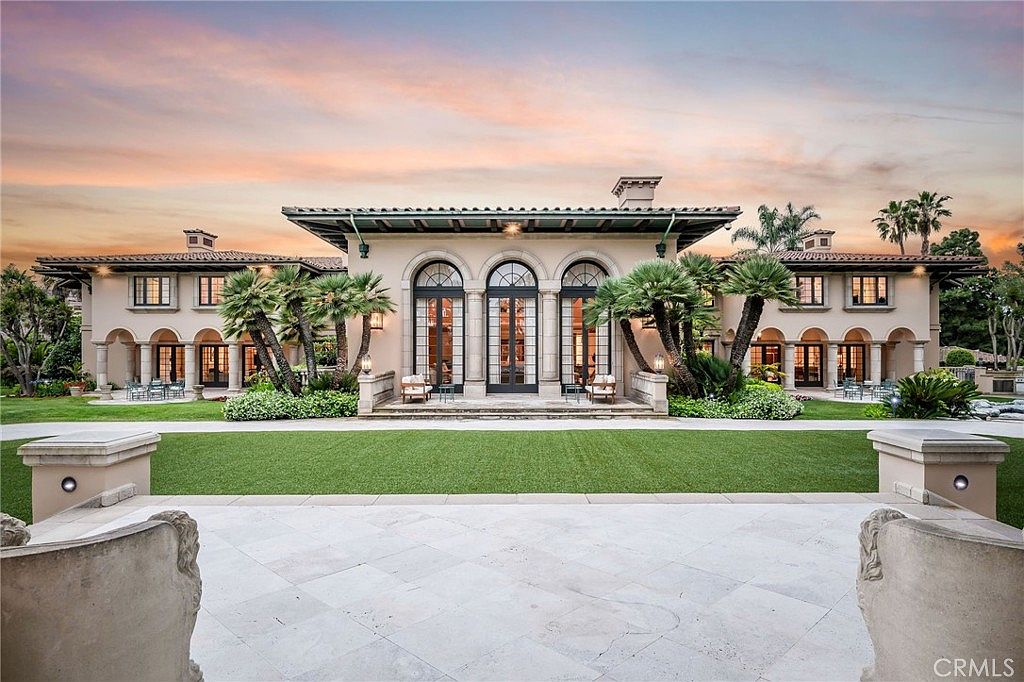 A stunning Mediterranean-inspired facade features graceful archways, soaring windows, and lush manicured landscaping, setting the stage for an impressive family residence. The symmetrical layout is designed for both elegance and functionality, with large glass doors inviting natural light into the home, creating an airy interior ambiance. Stone columns and terracotta roof tiles add classical charm, while the spacious patio and vast green lawn offer ample space for children to play and families to gather outdoors. Tropical palms and tailored garden beds enhance curb appeal, reflecting a perfect blend of luxury and comfort for making lasting memories.