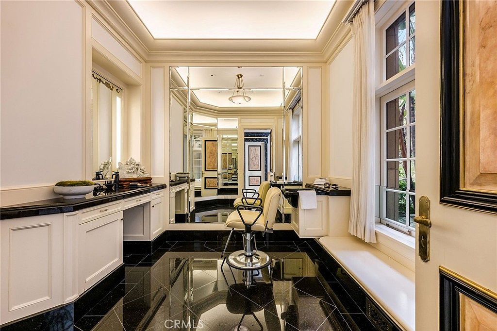 A luxurious home salon featuring glossy black tile flooring, built-in white cabinetry with sleek dark countertops, and expansive mirrored walls for an elegant, open atmosphere. The space is illuminated by soft recessed ceiling lighting, creating a bright yet soothing environment. Large windows with classic white curtains invite natural light and garden views, while a bench under the window offers seating or a restful spot for family members. A professional styling chair centers the room, ideal for pampering at home. The monochromatic palette, thoughtful storage, and spacious layout make this area both sophisticated and perfectly suited to family gatherings or self-care routines.
