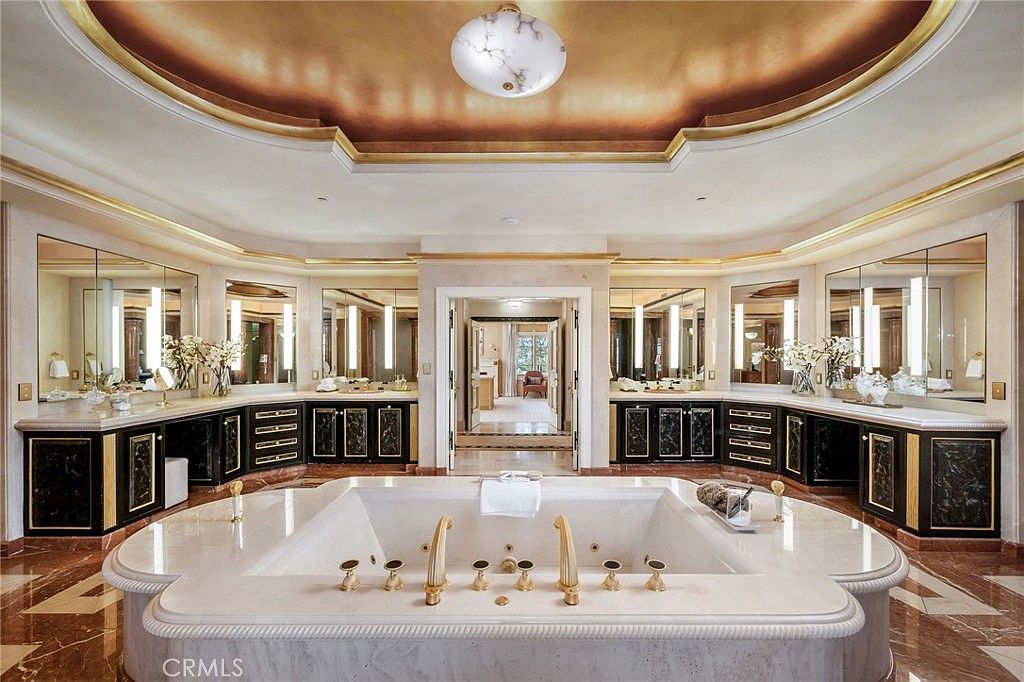 A breathtaking master bathroom exudes opulence with a grand soaking tub as its centerpiece, surrounded by elegant marble flooring and luxurious gold accents on fixtures and trim. The double vanity and ample counter space feature dark cabinetry detailed with gold trim, while expansive mirrors along the walls enhance the sense of space and light. Soft lighting from ceiling fixtures and modern sconces creates a warm ambiance. The neutral color palette, combined with floral arrangements and thoughtful decor, offers a serene and inviting atmosphere, making it a retreat suitable for both relaxation and family routines. Spacious layout ensures comfort and accessibility for all family members.