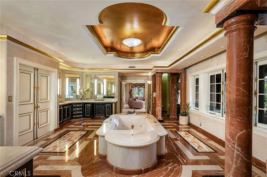 A spacious master bathroom features a freestanding soaking tub at its center, surrounded by polished marble floors in rich earthy tones. Ornate columns and gold accents add a regal touch while a tray ceiling finished in metallic gold brings warmth and drama overhead. The double vanity includes elegant dark cabinetry with ample storage, topped with generous mirrors for a bright, open feel. Large, mullioned windows bring in natural light, with nearby greenery enhancing the space’s calming ambiance. The layout caters to both privacy and family convenience, with a double-door entry and open access to an adjoining sitting area beyond.