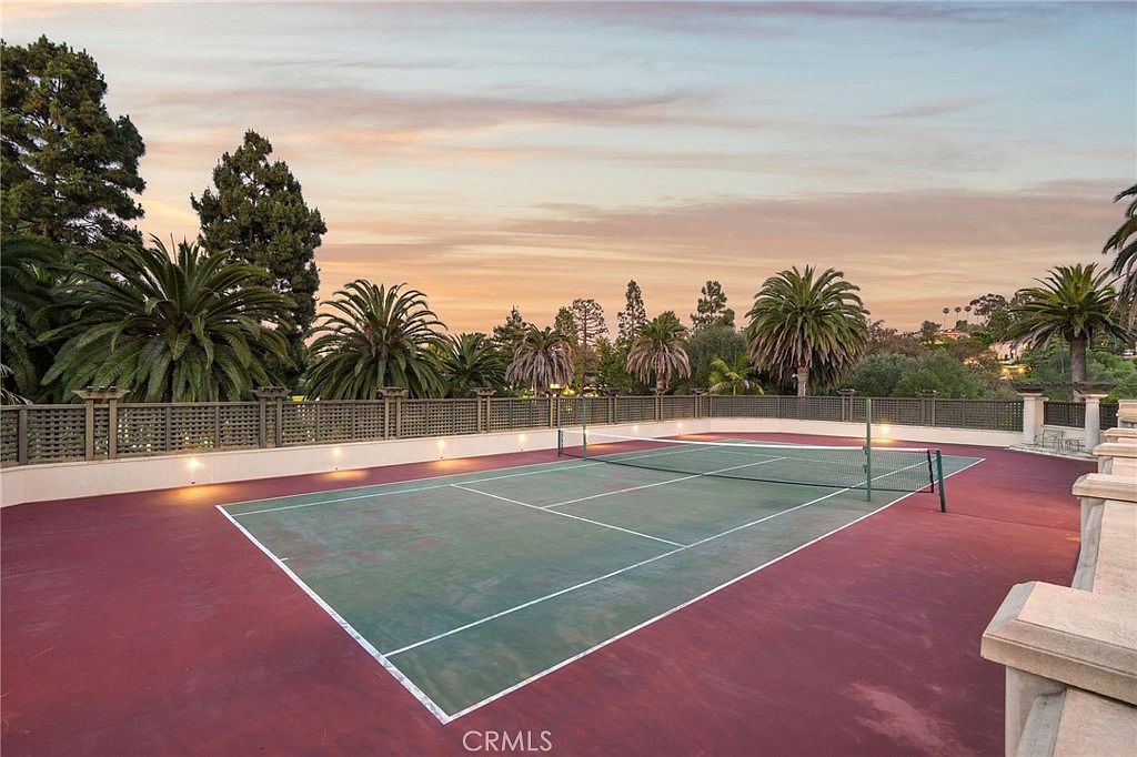 A spacious outdoor tennis court set against a backdrop of lush palm trees and mature landscaping, ideal for both casual family matches and competitive play. Elevated terraces with elegant stone balustrades and integrated lighting create a sense of luxury and safety, making the area perfect for gatherings at any time of day. The court’s well-maintained surface is surrounded by a stylish privacy fence, ensuring an exclusive feel. With ample room for onlookers to relax adjacent to the court, this outdoor amenity encourages active family fun while maintaining a private, resort-like atmosphere perfect for entertaining all ages.