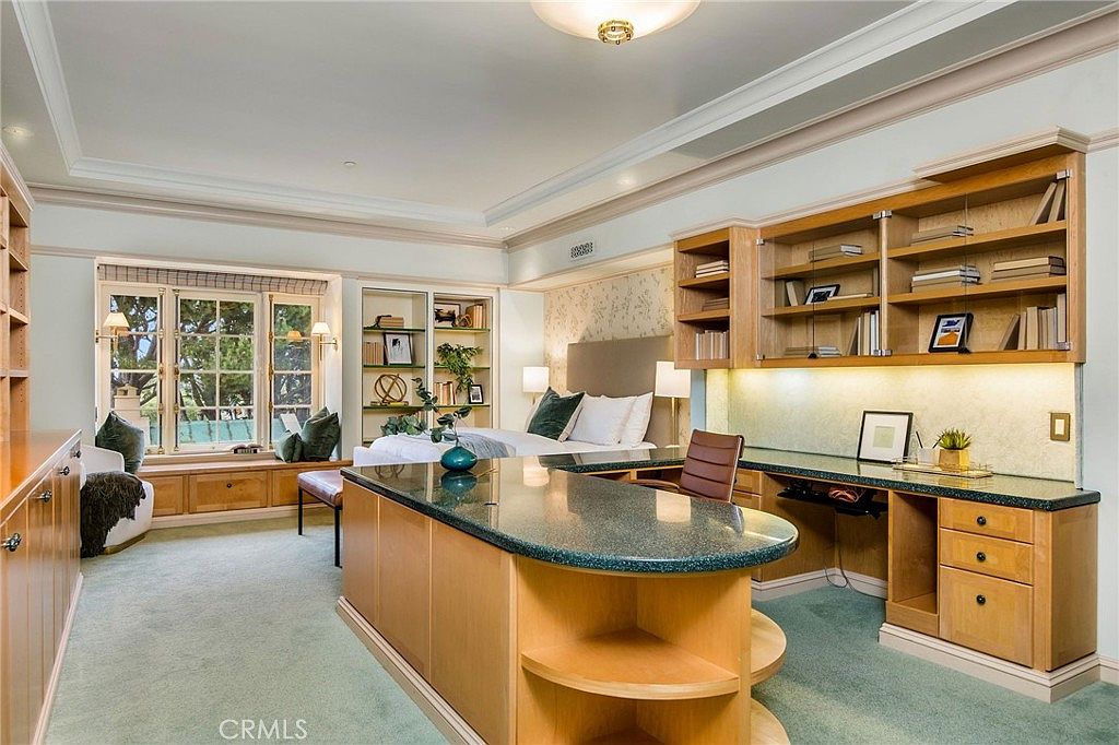 This spacious bedroom seamlessly integrates a functional work nook and lounging area, perfect for a modern family lifestyle. Light-wood built-in cabinetry provides ample shelving and storage, with a wrap-around desk offering a stylish workspace ideal for homework or remote work. The plush green carpeting complements the soothing cream walls and light wood, while the large window seat invites relaxation and offers beautiful views. Family-friendly features include organized book storage, accessible shelving for decor or playthings, and a versatile central island. Soft accent lighting and coordinated contemporary furniture unify the serene, inviting atmosphere, ideal for productivity, comfort, or winding down as a family.