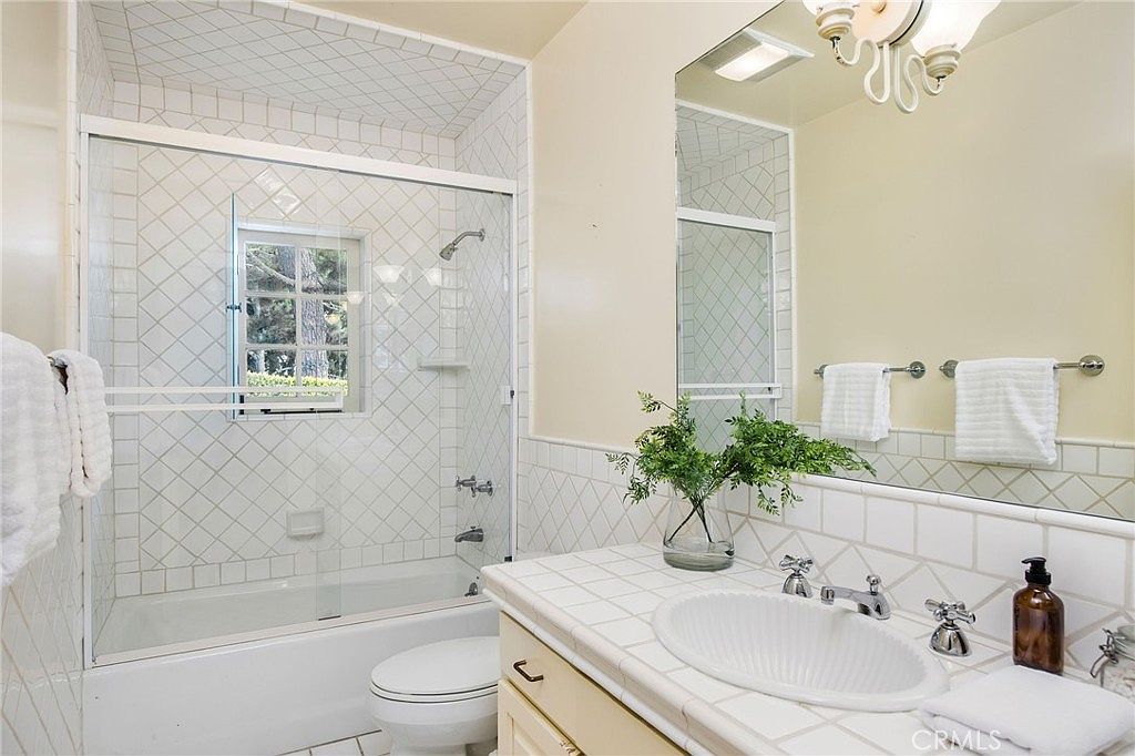 A bright and welcoming bathroom featuring a classic white tile design that extends seamlessly from the countertop to the shower walls and ceiling, creating a cohesive look. The spacious vanity offers ample counter space, topped with a ribbed oval sink and chrome fixtures. Thoughtful family-friendly details include double towel racks, a sliding glass shower door, and a built-in seat in the tub, ideal for children or elderly family members. Large windows bring in natural light, softening the white palette and making the space feel fresh and airy. Greenery in a simple vase adds a touch of nature and elegance.