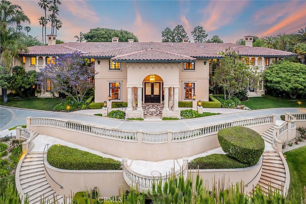A stunning mansion façade greets visitors with a sweeping double staircase, elegant balustrades, and lush symmetrical landscaping. The stucco exterior, complemented by a classic tile roof, exudes timeless sophistication. Columns flanking the entryway add a touch of grandeur, while warm ambient lighting from the windows promises a welcoming atmosphere inside. Mature trees and manicured hedges provide privacy and aesthetic appeal, creating a serene family-friendly setting. The spacious circular driveway easily accommodates guests, perfect for gatherings. The harmonious color palette of creamy beige and earthy terracotta tones creates a sense of luxury and relaxation, inviting you into the home.