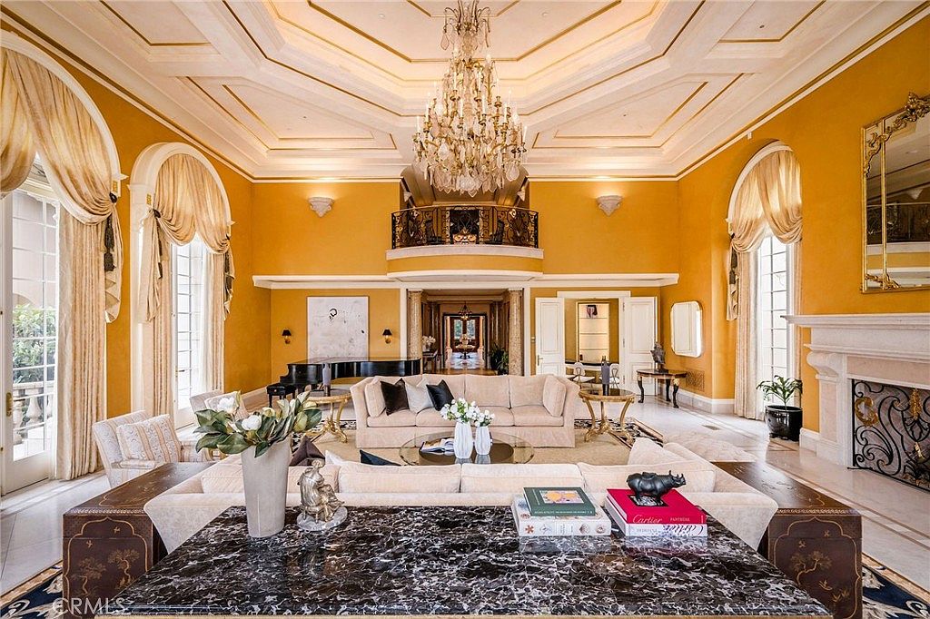 A spacious, elegant living room features soaring ceilings with intricate tray detailing and a regal chandelier as its centerpiece. The space is flooded with natural light thanks to tall, arched windows framed by luxurious, gold-hued drapes, complementing the warm mustard walls. Comfortable, family-sized sofas are arranged to encourage conversation, flanked by stylish accent chairs. Polished marble surfaces, including a substantial coffee table and an ornate fireplace, add sophistication. Decorative details like fresh flowers, books, and tasteful art elevate the room. The open layout, balcony, and grand piano create a welcoming atmosphere, perfect for gatherings, relaxation, or family activities.