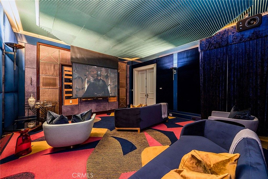 A luxurious home theater room designed for family entertainment, featuring a large projection screen framed by sophisticated geometric wood paneling. Plush, modern sofas and armchairs in rich navy and grey tones are arranged for optimal viewing, offering comfortable seating for everyone. Vibrant, abstract carpeting in maroon, navy, and gold brings energy and warmth to the space, while dark velvet curtains enhance sound insulation and cinematic ambiance. The ceiling’s striking textured design with subtle lighting adds a contemporary flair. Side tables and soft lighting fixtures create a welcoming atmosphere, making it ideal for cozy movie nights or gatherings with loved ones.