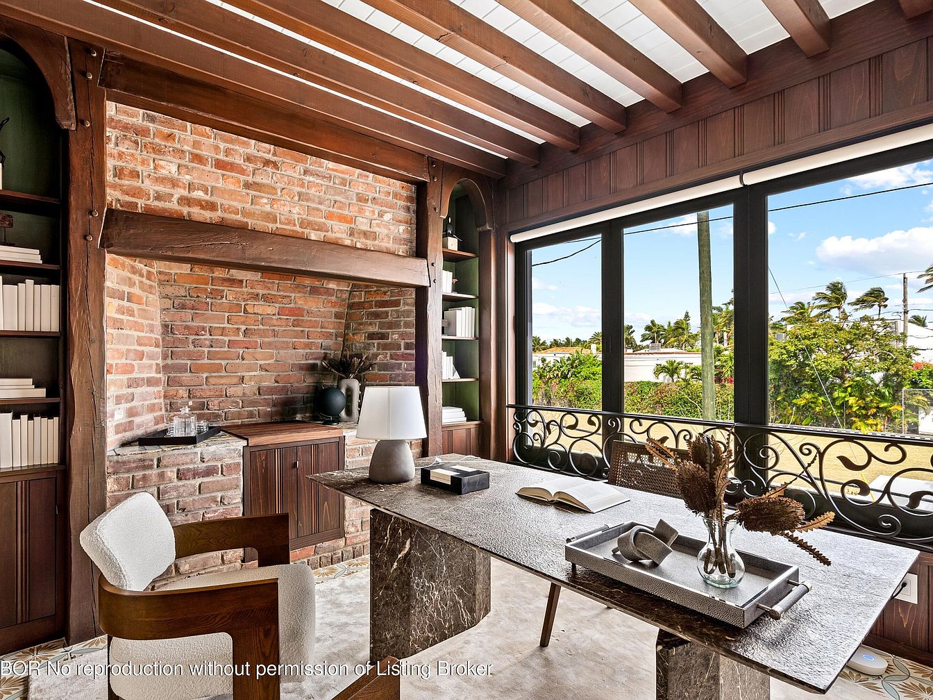 This cozy home office blends rustic charm with modern aesthetics, featuring exposed wooden beams overhead and a striking brick accent wall that adds warmth. A sleek, marble-topped desk contrasts beautifully with the natural textures, providing a functional workspace bathed in natural light from expansive windows. The plush chair offers comfort for long hours of productivity, while built-in bookshelves elegantly display a curated collection, perfect for family gatherings or quiet moments. A wrought-iron railing enhances the view, merging indoor elegance with the vibrant outdoor landscape. This inviting space encapsulates a perfect balance of style and comfort.