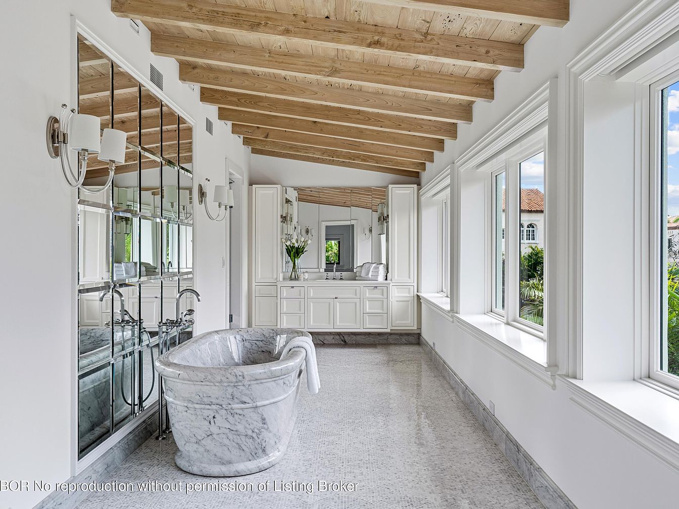 This stunning bathroom features a sleek layout adorned with a serene color palette of whites and soft grays, creating an inviting ambiance. The ceiling showcases exposed wooden beams that add warmth and charm, contrasted by polished marble tiling that enhances the space’s elegance. A luxurious freestanding marble bathtub sits gracefully, inviting relaxation and tranquility. Natural light floods in through expansive windows, highlighting the pristine cabinetry and chic fixtures, while the modern mirrors provide a touch of sophistication. Thoughtfully designed for both comfort and aesthetics, this bathroom exemplifies a perfect balance between functionality and refined style.