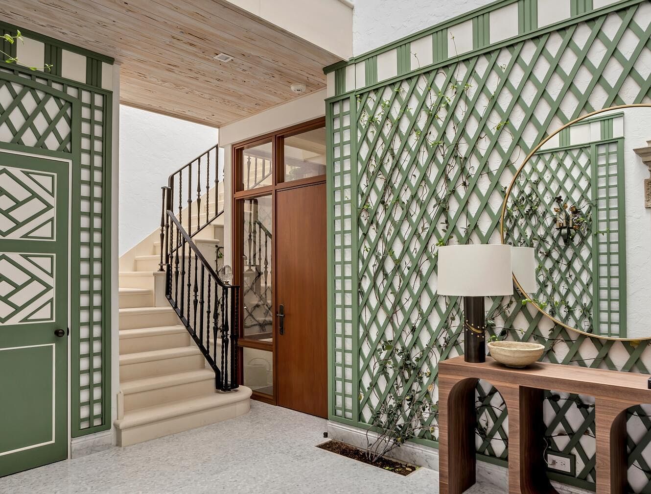 This inviting entryway showcases a harmonious blend of modern and traditional elements. The striking green latticework contrasts beautifully with the warm wood tones of the ceiling and the rich brown door, creating a welcoming ambiance. A spiral staircase, adorned with sleek black railings, leads to the upper levels, enhancing the open layout. A stylish wooden console table serves as a functional yet elegant addition, complemented by a contemporary lamp and decorative bowl. Soft, neutral tones on the walls and flooring reflect natural light, while greenery along the lattice adds a refreshing touch, making this space feel vibrant and family-friendly.