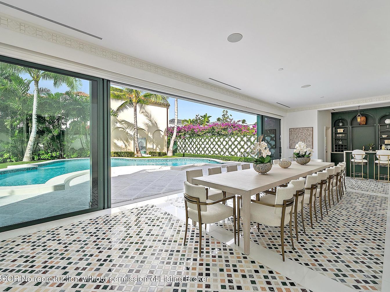 A stunning dining area opens up to a sunlit pool and vibrant garden, blending indoor and outdoor living seamlessly. The spacious table, adorned with chic decor and delicate floral arrangements, invites family gatherings and entertaining. Light, neutral tones enhance the room’s airy feel, complemented by the eye-catching mosaic tile flooring that adds warmth and character. Large sliding glass doors frame the exquisite outdoor view, allowing natural light to flood the space. Elegant, plush seating surrounds the table, creating a comfortable yet sophisticated atmosphere. Architectural details, like the intricately designed ceiling, elevate the overall aesthetic, embodying modern luxury.