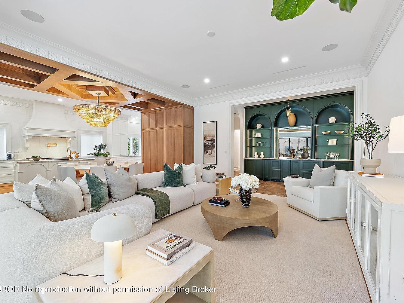 This sophisticated living room seamlessly blends comfort and elegance, featuring a spacious layout enhanced by natural light. The centerpiece, a stunning chandelier, complements the intricate wooden beams overhead, adding architectural depth. Plush sofas, adorned with textured throw pillows in soft greens and grays, invite relaxation, while a sculptural coffee table adds a modern touch. The muted color palette of whites and neutrals creates a serene atmosphere, perfect for family gatherings. An eye-catching dark-green built-in shelf showcases decorative items, enhancing visual interest and serving as a focal point, while the overall design promotes a warm, inviting ambiance.