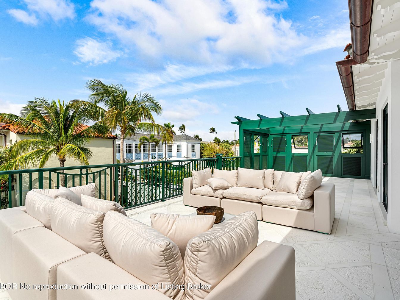 This outdoor lounge area blends comfort and elegance, featuring a spacious sectional sofa dressed in light, plush upholstery, ideal for family gatherings. The expansive balcony is framed by lush palms, enhancing a tropical aesthetic that welcomes natural light. Architectural elements like the sleek, green wooden railings contrast beautifully with the white tile flooring, creating a serene atmosphere. The pergola above provides partial shade, making this space perfect for both sun-soaked afternoons and cool evenings. Thoughtfully designed for relaxation and entertainment, it invites cherished moments with family and friends against a picturesque backdrop.