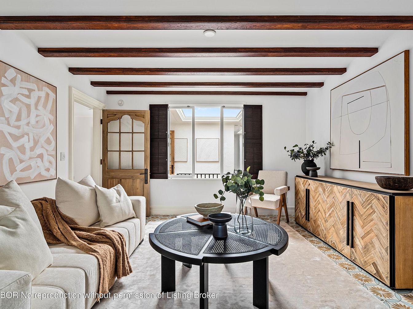 This inviting living room combines modern comforts with timeless design. The space features exposed wooden beams that enhance the airy atmosphere, complemented by large windows that flood the room with natural light. A plush sectional sofa, adorned with soft throw pillows and a cozy blanket, offers an inviting spot for family gatherings. The patterned area rug adds warmth underfoot, while the sleek coffee table showcases a blend of black metal and intricate wood inlay. Additionally, the rich textures of the cabinetry provide essential storage, harmonizing beautifully with the minimalist art pieces that adorn the walls.