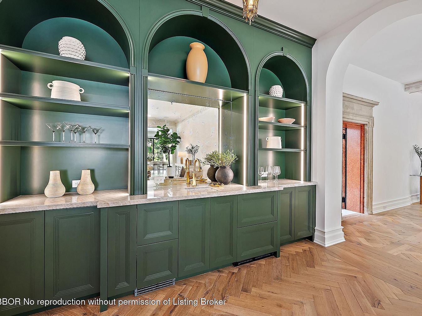 This elegant home bar area features a striking green cabinetry that showcases arch-top shelves, lending a sophisticated touch. The serene color scheme of deep green and soft white creates a calming atmosphere, complemented by a beautiful marble countertop. Thoughtfully arranged decor items, including stylish vases and glassware, enhance its charm while maintaining a functional layout. The warm wooden herringbone flooring adds richness and depth, perfect for family gatherings and entertaining. Ambient lighting highlights the space, creating an inviting vibe, making it an ideal spot for relaxation and socializing with friends and family.