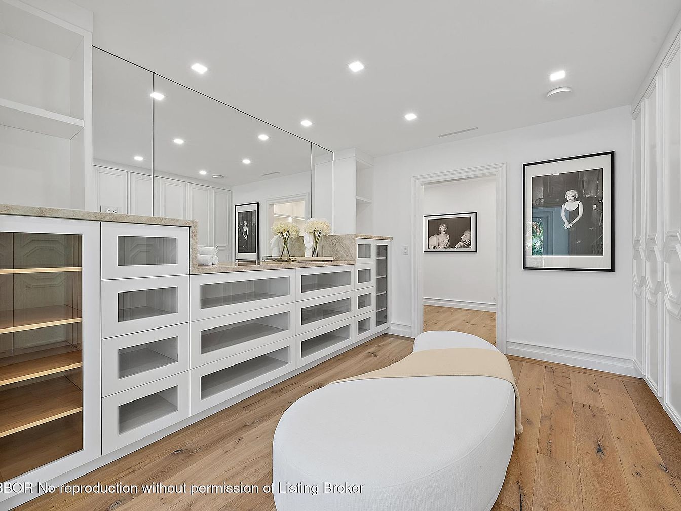 This entryway features a sleek design with a modern aesthetic, welcoming visitors into a spacious and bright area. The built-in cabinetry, equipped with both glass and wooden accents, offers ample storage while maintaining an airy feel. The polished surfaces reflect light, enhancing the overall brightness of the space. A unique curved bench provides a stylish seating option, inviting relaxation. The warm wood flooring beautifully contrasts the crisp white walls, creating a cozy yet contemporary atmosphere. Framed black-and-white photographs add a touch of personal character, making this entryway an elegant introduction to the home.