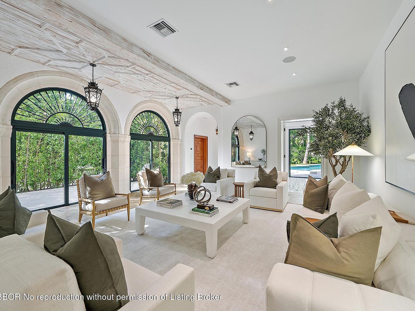 This spacious living room features an airy layout, highlighted by large arched windows that invite abundant natural light and offer views of the lush outdoors. The neutral color palette, with soft whites and muted greens, creates a calming atmosphere. Plush sofas adorned with oversized pillows provide comfort, while stylish accent chairs enhance the space’s inviting feel. Unique architectural elements, such as the beautifully detailed ceiling beams and elegant pendant lights, add character. A curated selection of art and decorative pieces on the coffee table further enhances the aesthetic, making it a perfect gathering spot for family and friends.