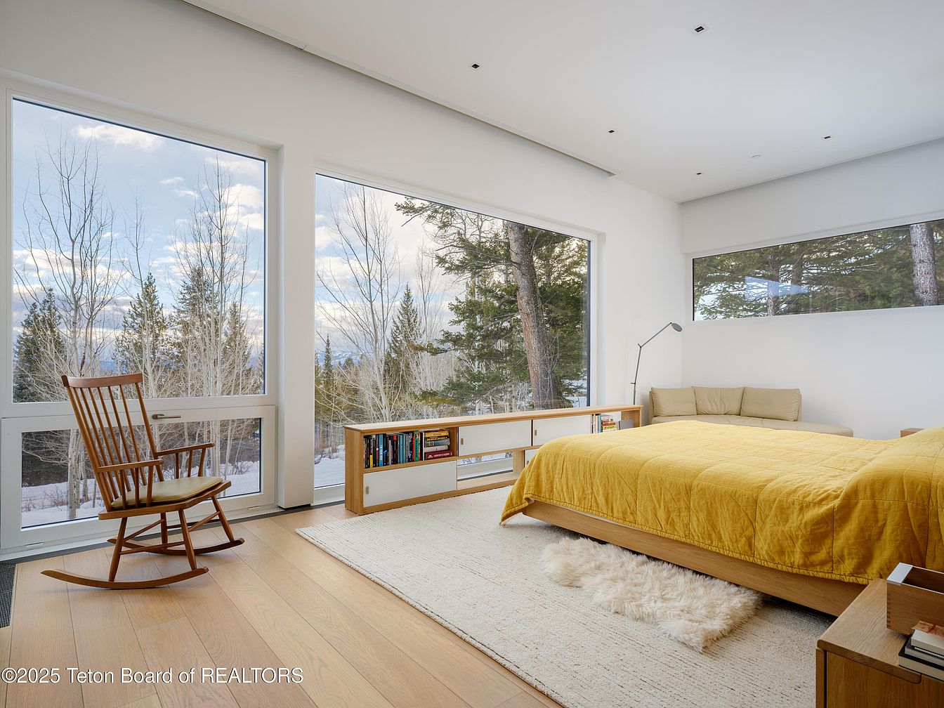 Surrounded by nature, this master bedroom features expansive windows that invite stunning views of the outdoors, creating a serene escape. The layout is open and airy, with a calming color scheme emphasizing soft whites and warm wood tones. A cozy yellow quilt drapes over the bed, accentuating the mid-century modern furnishings. Natural light filters through, highlighting the charm of a classic rocking chair and a sleek, minimalist bookshelf filled with curated reads. The plush area rug underfoot offers comfort, while the clean lines and architectural details showcase a sophisticated yet inviting atmosphere, perfect for relaxation and rejuvenation.