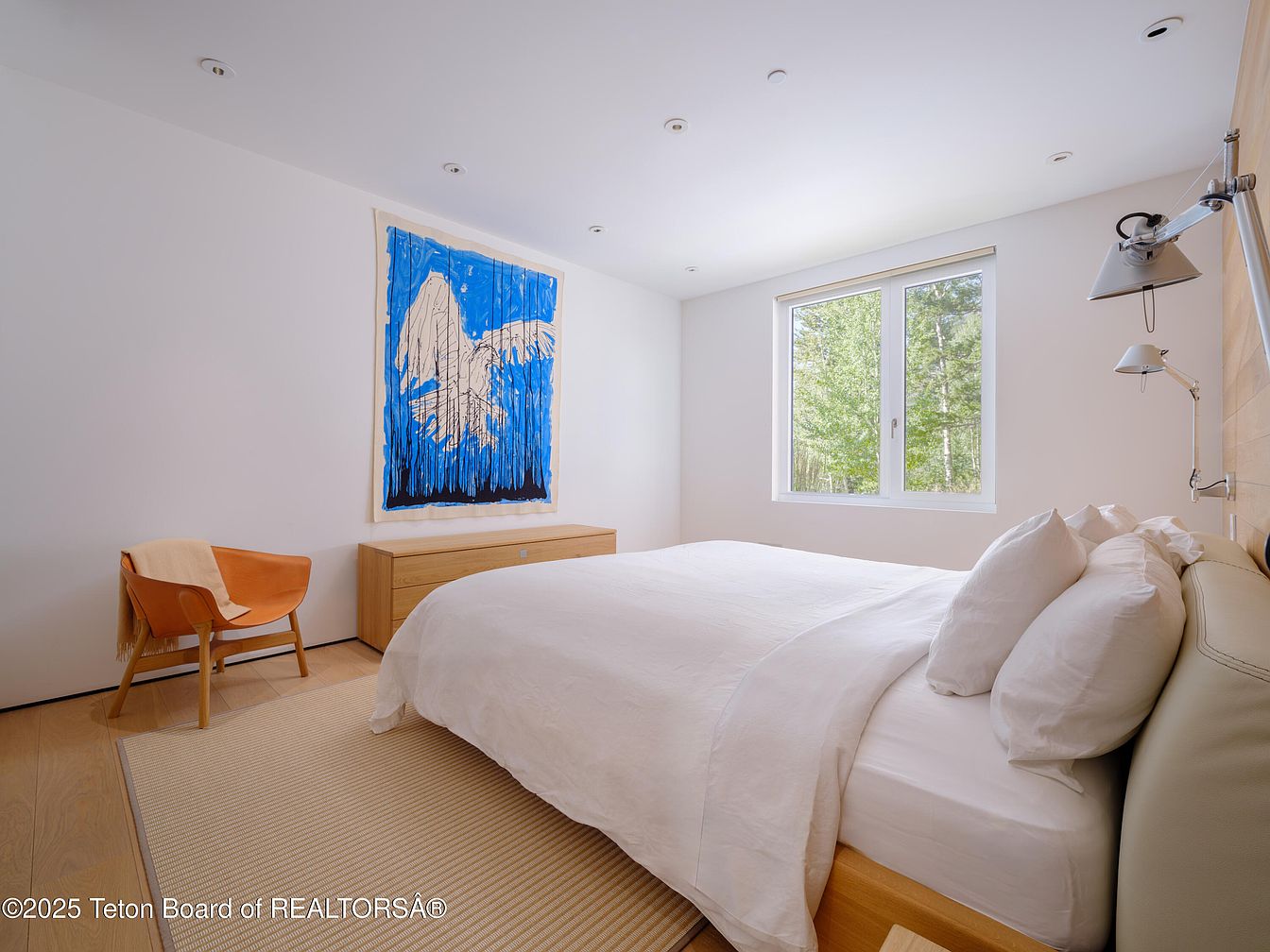 This serene master bedroom showcases a minimalist design with a calming color palette. The large windows invite natural light and frame views of lush greenery outside, enhancing the tranquil atmosphere. The elegant bed, adorned with plush white bedding, is complemented by a stylish light wood headboard that adds a touch of warmth. A beautiful piece of abstract art in vibrant blue adds a striking focal point above the bed. The cozy seating area features a contemporary chair, perfect for relaxation. Functional yet stylish, the space combines comfort and modern aesthetics for a peaceful retreat.