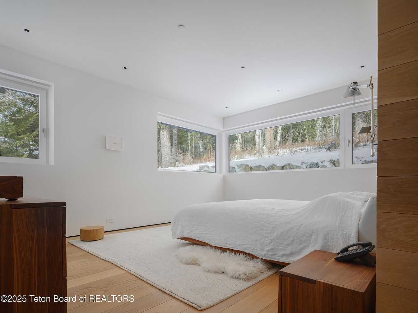 This master bedroom features a serene design with large, modern windows that invite natural light and provide beautiful views of the surrounding greenery, creating a tranquil atmosphere. The space boasts a minimalist aesthetic, with a plush white bedding set atop a sleek wooden bed frame complemented by warm wood flooring. A soft area rug adds comfort, while a cozy accent stool enhances the inviting feel. Architectural elements include recessed lighting and clean lines, emphasizing simplicity. Family-friendly features such as ample storage and easy-to-clean surfaces make it practical, ensuring it remains a relaxing retreat for everyone.