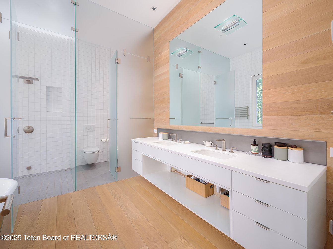 This modern bathroom showcases a seamless blend of functionality and style. Featuring a spacious vanity with minimalist white cabinetry and dual sinks, the layout promotes efficient family use while maximizing storage. Rich wood accents create warmth against the sleek, tiled shower area, which boasts glass doors for an airy feel. The neutral color palette of soft whites and warm wood enhances the serene ambiance, complemented by stylish fixtures that add a touch of sophistication. Ample natural light filters through a strategically placed window, illuminating the space and making it inviting, perfect for daily routines and relaxation.