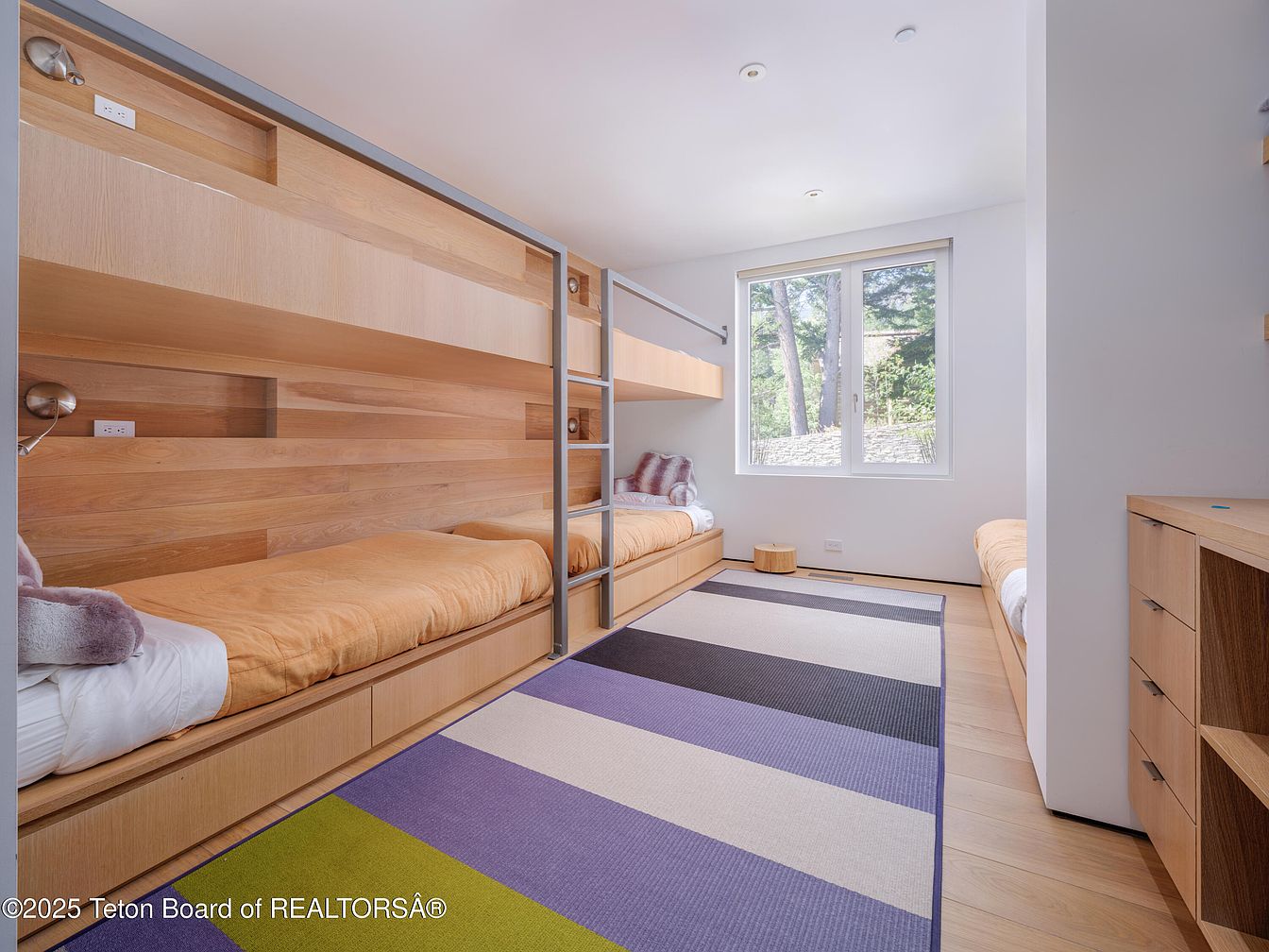 This vibrant kid’s bedroom features a modern, minimalist design emphasizing functionality and comfort. The room is anchored by a clever layout with two built-in beds, complemented by ample storage beneath, allowing for a tidy and organized space. A playful color scheme—soft oranges and calming purples—adds a cheerful atmosphere. Natural light floods through a generously sized window, enhancing the airy feel and providing views of the outdoors. The sleek wood paneling and soft area rug create a warm and inviting touch, making it an ideal retreat for children to relax, play, and grow.