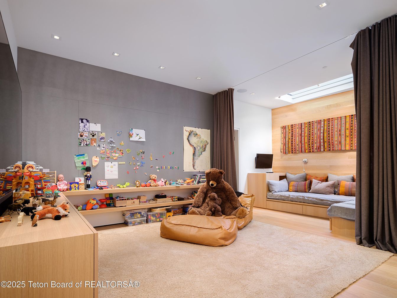 This delightful kid’s bedroom blends comfort and creativity, featuring a playful yet stylish layout. Soft, textured rugs create a cozy atmosphere, complemented by a warm wooden accent wall that adds natural charm. A spacious play area is adorned with low shelves filled with toys and colorful art, encouraging imaginative play and organization. The oversized beanbag chair invites relaxation, while a snug reading nook lined with plush cushions provides a perfect retreat for storytime. Subtle gray walls enhance the playful decor, while large curtains offer both functionality and warmth, making this space a family-friendly haven filled with joy.