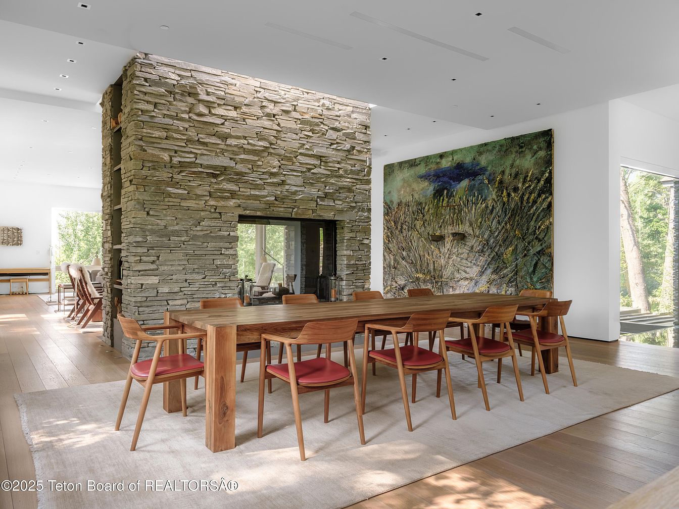 This dining room showcases a stunning blend of modern and natural elements. A striking stone fireplace serves as a focal point, surrounded by expansive windows that invite natural light and views of the outdoors. The large wooden dining table, complemented by mid-century modern chairs featuring rich, red upholstery, creates a warm, inviting atmosphere ideal for family gatherings. A soft area rug underfoot adds comfort, while the high ceilings and minimalist design enhance the spacious feel. Artistic flair is introduced through the abstract wall art, adding a unique touch to this elegant yet functional space.