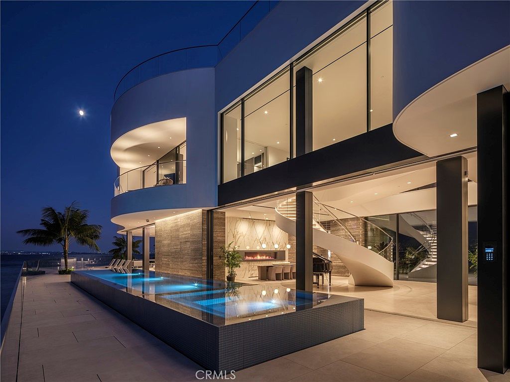 A stunning modern exterior reveals a sleek, open-concept patio with an infinity-edge pool running alongside the home, perfect for family relaxation and entertaining. The design seamlessly blends indoor and outdoor spaces with floor-to-ceiling glass walls that let in abundant natural light. A grand sculptural staircase elegantly curves inside, visible from the patio, while warm, ambient lighting adds a welcoming touch for evening gatherings. Neutral tones dominate, complemented by subtle metallic finishes and natural stone textures. Lounge chairs by the pool invite sunbathing and play, making this area an ideal hub for both sophisticated entertaining and family fun.