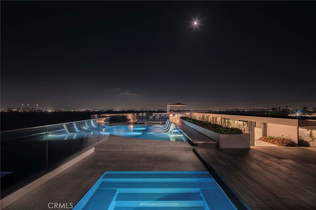 A luxurious rooftop pool oasis is accented by stunning city lights under a tranquil night sky. Sleek glass railings and modern stone tiles frame the sparkling pool and spa area, offering both safety and unobstructed views, perfect for families to relax together. A long planter box with carefully arranged greenery softens the contemporary lines, while integrated lounge chairs invite leisurely conversations and sunbathing by day or star gazing at night. Subtle, neutral hues in the flooring contrast beautifully with the cool blue pool water, creating an inviting and serene ambiance for gatherings or quiet moments. This space beautifully merges luxury, comfort, and breathtaking views.